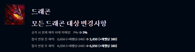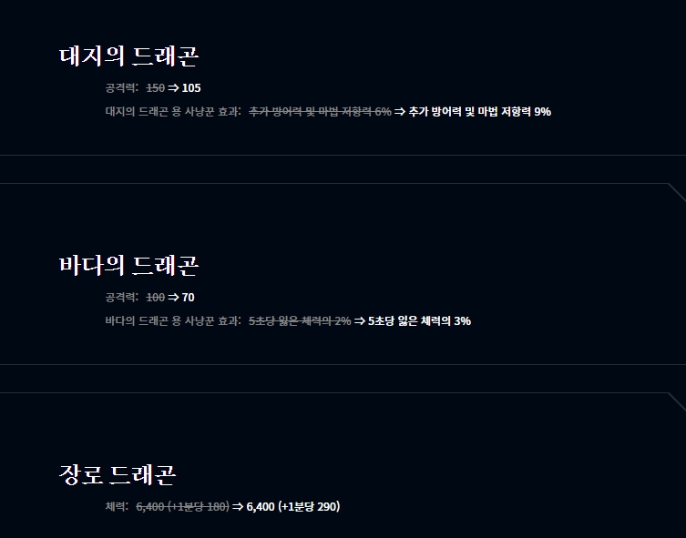 스펠 강타와 탈진이 너프되었으며, 드래곤들이 대체적으로 약해졌고, 반면 처치시 얻는 효과는 늘어났습니다. 또한 이제 두 번째 소환한 전령은 체력이 75% 증가하고, 또한 전령을 처치하면 주변 챔피언들도 200골드를 나눠받게 되었습니다. 미드나 탑 라이너들이 정글러를 도와 전령을 잡는 모습을 자주 볼 수 있겠습니다.