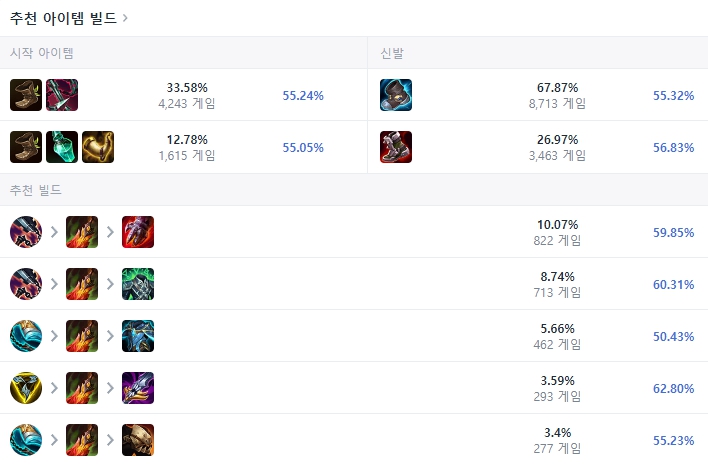 처음 시작은 강철가시 채찍과 신발로 시작하여 첫 코어 아이템은 선혈포식자를 올려줍니다. 그리고 보통 CC기에 어느정도 저항하고 상대를 물기 위해 헤르메스 신발을 올려줍니다. 다음에는 죽음의 무도까지는 공통으로 올리고, 이후부터는 상대방에 공격에 어느정도 버틸 수 있다면 스테락의 도전을, AP딜이 강하면 정령의 형상을, AP와 AD딜이 모두 강하면 대자연의 힘을, 딜링도 늘리고 마법 저항력도 늘리려면 멜모셔스를 이처럼 유동적으로 상황을 보고 템트리를 올려주면 됩니다.