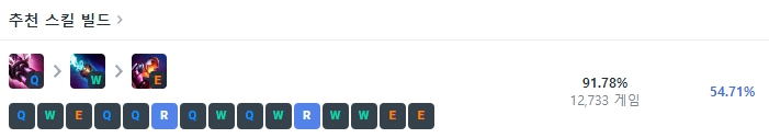 Q스킬을 찍어 공격 속도를 확보가 우선입니다. 처음 3레벨에는 Q, W, E 스킬을 찍어주고 이후 4레벨부터 R-Q-W-E 순서로 스킬을 마스터해줍니다.