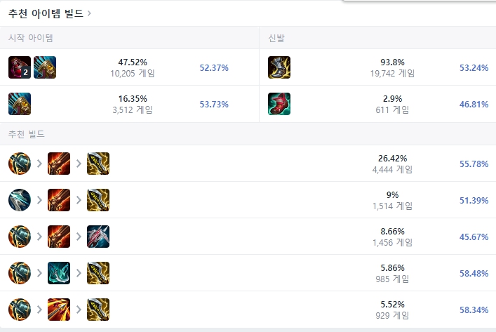 절정의 화살과 포션 두 개로 시작해주며 크라켄 학살자 또는 돌풍을 선택해주셔야 합니다. 이후 광전사의 신발을 띄우고 고속 연사포, 무한의 대검까지 고정으로 띄워줍니다. 그 이후에는 상황을 보며 유동적으로 도미닉 경의 인사, 피바라기, 루난의 허리케인, 멜모셔스의 아귀 등을 올려주면 됩니다.