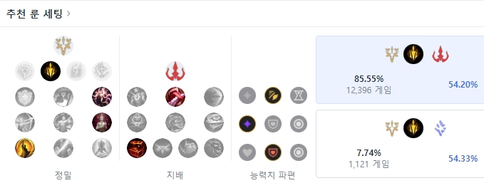 칼바람 나락 징크스 룬은 정밀에서 치명적 속도를 메인 룬으로 사용합니다. 하위 룬으로는 침착과 전설: 핏빛 길, 그리고 최후의 일격을 들어주고 보조룬으로는 지배에서 피의 맛과 보물 사냥꾼을 들어줍니다. 능력치 파편의 경우 원거리 딜러인 만큼 공격 속도가 중요하기에 공격 속도 하나와 적응형 능력치, 그리고 방어력을 껴주면 되겠습니다.