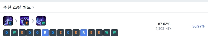 처음 시작 3레벨에는 여느 챔피언들과 마찬가지로 쉔도 Q, W, E스킬을 하나씩 찍어줍니다. 이후 4레벨부터는 R-Q-E-W 순서로 스킬을 마스터해주시면 됩니다.