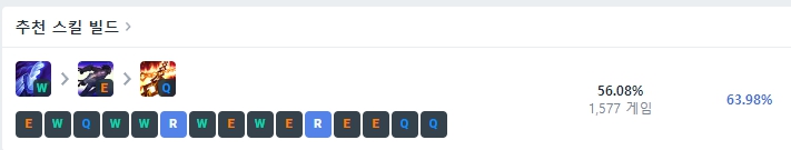 1레벨에는 E스킬, 2레벨에는 W, 3레벨에 Q를 찍고 이후 4레벨부터 R-W-E-Q 순서로 스킬을 마스터해주시면 됩니다.