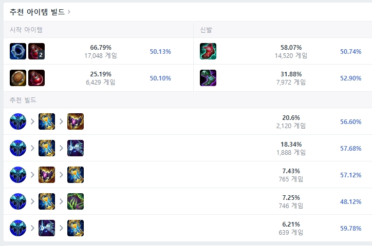 사일러스는 자체 딜링이 약한 편이 아니며 거기에 교전 중 정복자가 터지면 그만큼 더욱 강해집니다. 그렇기 때문에 어느정도 탱이 되는 메이지 아이템들을 올려줍니다. 처음 시작은 도란의 반지와 포션 두 개로 시작하며 이후 만년 서리와 아이오니아 신발을 올려줍니다. 그 다음에는 존야의 모래시계까지 확정으로 올려주고 이 다음부터는 상황을 보고 그림자 불꽃, 우주의 통찰력, 모렐로노미콘 등을 유동적으로 올려주시면 됩니다.