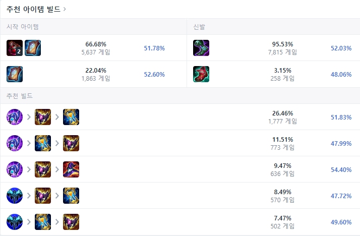 처음 시작은 사라진 양피지와 포션 두 개를 구매해주며 이후 첫 코어 아이템으로는 루덴의 메아리를 올려줍니다. 그리고 마관신을 띄운 뒤 그림자 불꽃, 존야의 모래시계를 올려주면 됩니다. 그 후에는 상황을 보고 유동적으로 벤시, 라바돈, 공허 등을 올려주면 됩니다.