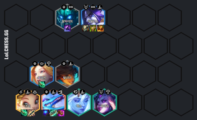 핵심 유닛인 솜에게 블루, 총검, 보건을 주고 사일러스에게 탱커형 아이템을 줍니다. 나머지는 적당히 쇼진의 창을 조이에게 준 뒤 AP템을 추가로 올려주면 됩니다.