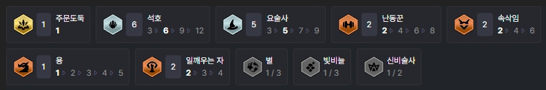 덱을 완성시켰을 때 챙길 수 있는 시너지는 주문도둑(1), 석호(6), 요술사(5), 난동꾼(2), 속삭임(2), 용(1), 일깨우는 자(2)입니다.