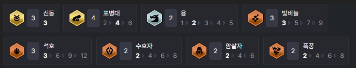 덱을 완성시키면 기본적으로 얻을 수 있는 특성들은 신동(3), 포병대(4), 용(2), 빛비늘(3), 석호(3), 수호자(2), 암살자(2), 폭풍(2)입니다.