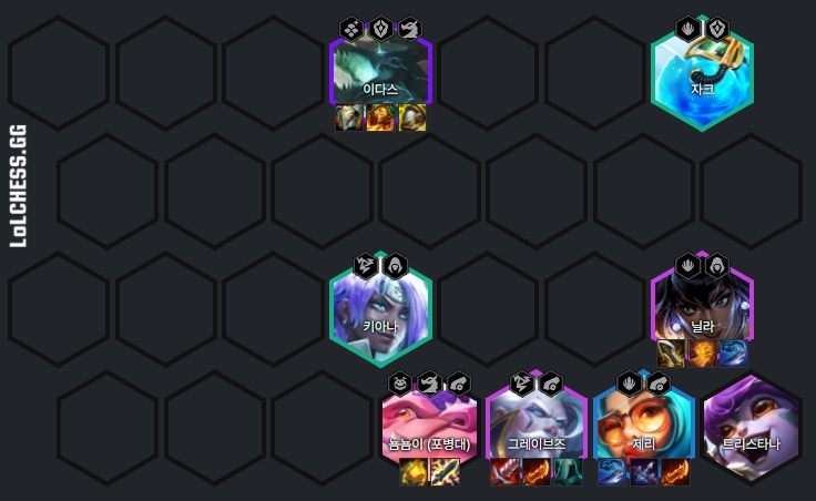 기본적으로 덱을 완성시키면 트리타나(뇸뇸이-포병대), 자크, 키아나, 제리, 그레이브즈, 닐라, 뇸뇸이, 이다스로 이루어져 있습니다. 용이 두 명 들어가기 때문에 9레벨을 달성해야 덱을 완성할 수 있으며, 8레벨인 경우 닐라를 마지막에 넣는 것을 추천드립니다.