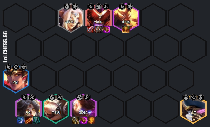 세주아니, 트위치, 라칸, 자야, 제이스, 헤카림, 바드, 쉬바나로 이루어져 있습니다. 9레벨을 찍어야 덱을 완성할 수 있습니다.