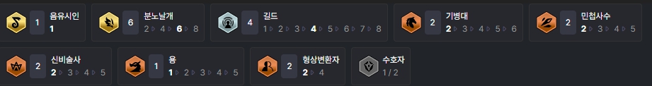 덱을 완성시키면 챙길 수 있는 특성은 음유시인(1), 분노날개(6), 길드(4), 기병대(2), 민첩사수(2), 신비술사(2), 용(1), 형상변환자(2)입니다.