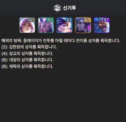 증강체는 전투 관련 증강체들은 무난한 편이며, 길드 관련 증강체가 제일 좋습니다. 또한 덱을 완성시키기 위해서는 고코스트 챔피언을 빨리 뽑아야 하기 때문에 레벨업 관련 증강체나, 상점 관련 증강체도 굉장히 잘 어울립니다.