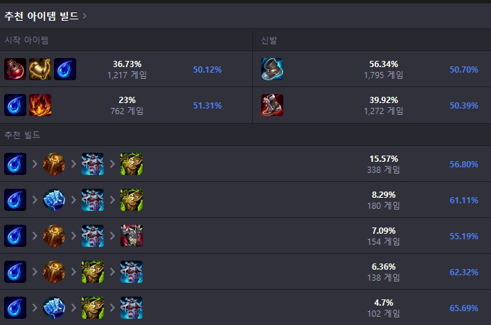 처음 시작 아이템은 포션 하나와 수호자의 뿔피리, 여신의 눈물로 시작해줍니다. 이후 첫 코어 아이템으로 태양불꽃 방패를 띄우고 헤르메스의 신발을 올린 뒤 종말의 겨울, 워모그의 갑옷을 가는게 가장 일반적입니다. 그 다음부터는 상황을 보고 대자연의 힘, 가시 갑옷, 얼어붙은 심장 등의 아이템을 올려주면 됩니다.