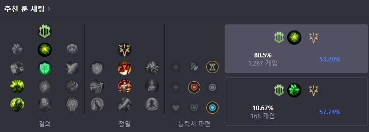 칼바람 오른의 룬은 결의에서 여진을 메인 룬으로 사용합니다. E스킬로 지형지물에 부딪혀 주변 적을 띄울 수도 있고, 궁극기를 통해 에어본을 하기도 쉽기 때문입니다. 하위 룬으로는 생명의 샘, 사전 준비, 과잉성장을 들어주고, 보조룬으로는 정밀에서 승전보와 전설: 강인함을 들어줍니다. 능력치 파편은 재사용 대기시간 감소, 방어력, 마법 저항력을 껴주면 됩니다.