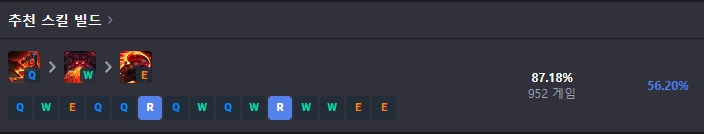 처음 시작 3레벨에는 Q스킬, W스킬, E스킬을 하나씩 찍어준 뒤 이후 R-Q-W-E 순서로 스킬을 마스터해주면 됩니다.