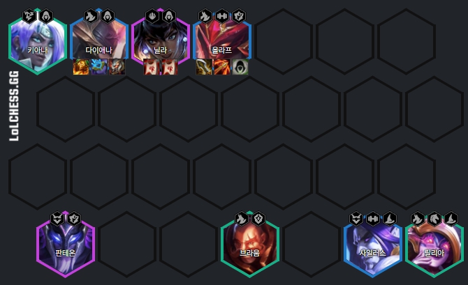 비늘혐오자 암살자 올라프덱은 릴리아, 브라움, 키아나, 다이애나, 사일러스, 올라프, 닐라, 판테온으로 이루어져 있습니다. 5코스트 이상의 챔피언이 필요하지 않고, 용도 들어가지 않아 비교적 쉽게 완성시킬 수 있습니다.