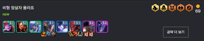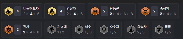 가장 핵심인 암살자 상징이 나오지 않는 경우 대신 피바라기를 주고 9레벨을 친 뒤 렝가를 집어넣으면 그렇게 해서도 비늘혐오자(4), 암살자(4)를 맞출 수 있긴 합니다. 초반의 경우 브라움을 레오나, 나서스와 사용하여 수호자(2)를, 키아나를 이즈리얼과 사용하여 폭풍(2)를, 올라프를 오공과 함께 사용하여 전사(2)를 받는 식으로 운영해주면 됩니다.
