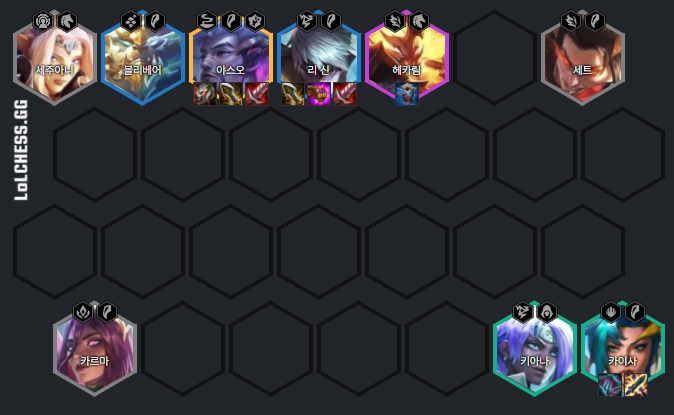 용술사 리신덱은 리신이 핵심 유닛으로 기본적으로 세주아니, 세트, 카르마, 카이사, 키아나, 리신, 볼리베어, 헤카림, 야스오로 이루어져 있습니다. 9레벨을 찍으면 덱을 완성시킬 수 있습니다.