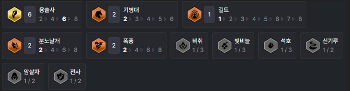 초반에는 키아나와 이즈리얼을 통해 폭풍(2)를 받거나 혹은 세주아니와 릴리아나 렐을 활용하여 기병대 특성을 살려주는것도 좋습니다. 그 외에는 적당히 레벨업을 쳐가면서 용술사 기물들을 모아주면 됩니다.