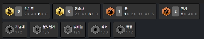 용술사 상징을 누누에게만 주었다고 가정했을 때 챙길 수 있는 시너지는 최대 용술사(6), 신기루(6), 전사(2), 용(1)입니다. 그러나 용술사(6)을 맞춰준 뒤에는 조금 더 유동성 있게 조합을 짜는 것도 괜찮습니다. 신기루 시너지가 별로인 경우 신기루 유닛을 하나 포기하고 대신 헤카림을 챙겨 분노날개(2), 기병대(2)를 챙길 수도 있습니다.