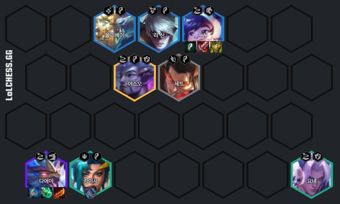 누누에게 용술사 상징, 피바라기, 워모그의 갑옷을 주는게 좋으며, 용술사(8)을 찍었다면 워모그 대신 정의의 손길을 줘도 좋습니다. 이후 다에야에게 대천사의 지팡이, 쇼진의 창, 구인수의 격노검을 주는게 좋고 카이사에게는 모렐로노미콘을 하나 넣어주면 좋습니다.