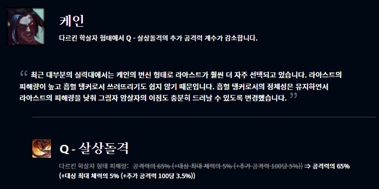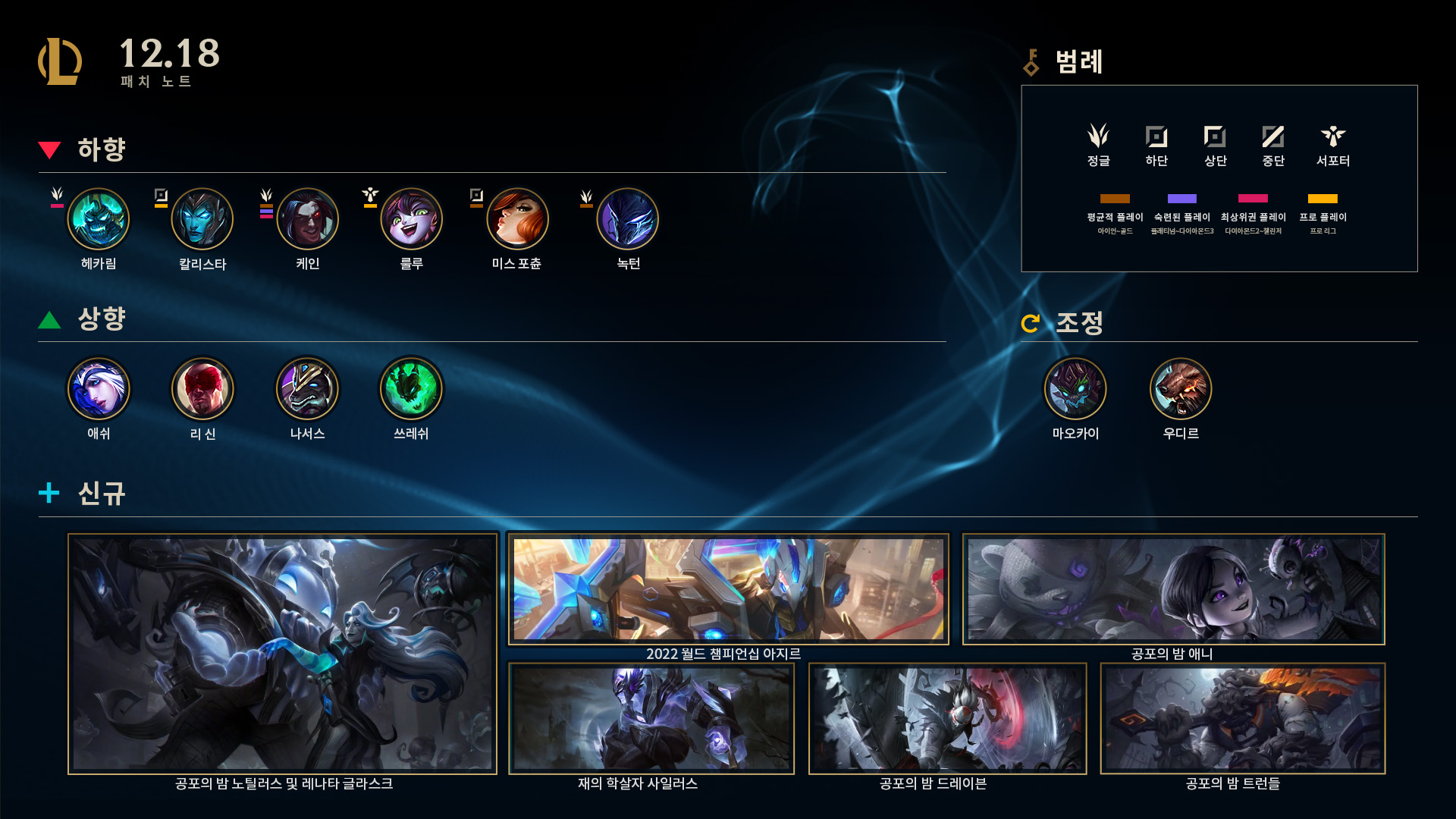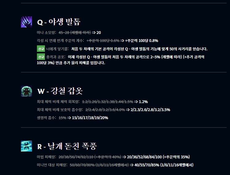 애쉬, 리신, 나서스, 쓰레쉬가 버프되었다고 하는데 나서스는 패치노트 명단에 없었습니다. 또 헤카림, 칼리스타, 케인, 룰루, 미스 포츈, 녹턴이 하향되었고 마오카이와 우디르는 조정되었습니다.