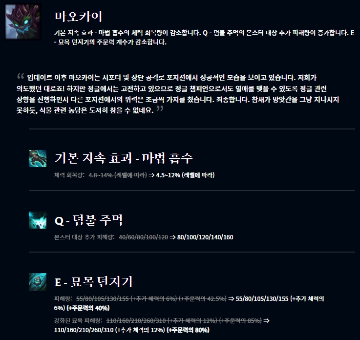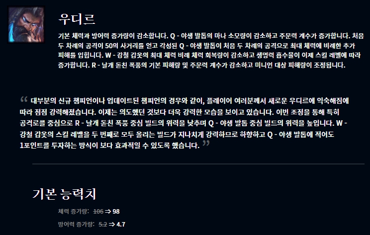 마오카이를 정글 챔피언으로 사용하도록 유도하는 라이엇의 모습입니다. 우디르의 경우 리메이크 되고 처음에는 익숙치 않기도 하고 뚜벅이라는 한계로 좋은 성적을 보여주지 못했지만 패치로 인해, 익숙해짐에 따라 특정 빌드가 너무 강력한 모습을 보여주었습니다. 그렇기 때문에 살짝 조정한 느낌입니다.