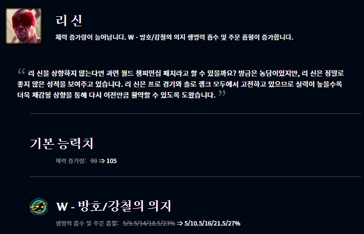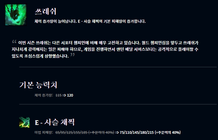 애쉬의 경우 서포터로 더 자주 보이는 현실이라 원래대로 원거리 딜러로 더 자주 사용하라고 Q스킬의 공격 속도가 버프되었습니다. 리신도 기본 체력 증가량이 늘어났고 W스킬 방호가 소폭 버프되었습니다. 쓰레쉬도 기본 체력 증가량이 버프되었고 E스킬의 마법 피해량이 증가했습니다.