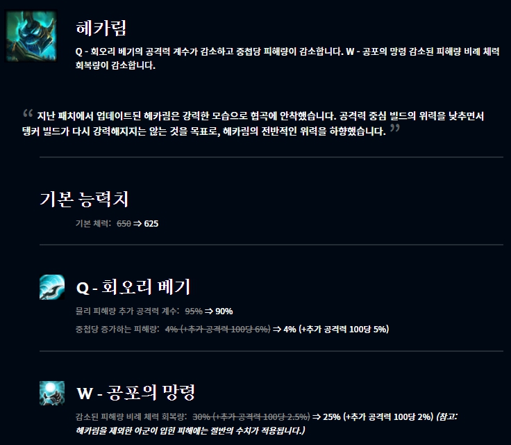 헤카림, 녹턴, 케인 이렇게 세 정글 챔피언이 너프되었습니다. 지난 번 패치 이후 다소 강력한 모습을 보여주었던 정글러 3명이 너프되었습니다. 그 외에도 원딜 역할군에서 지나치게 활약중인 칼리스타, 미스 포츈을 너프시켰고, 전통 유틸 서포터인 룰루도 약간의 너프를 먹었습니다.