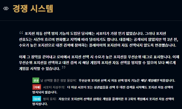우선순위 포지션 선택 시 자동 선택 방지기능이 있으며 만약 원하지 않는 라인이 걸린다면 그 판이 끝난 뒤 이후 2번의 게임에서는 포지션 자동 선택이 되지 않습니다. 또 명예를 부여한 플레이어나 자신에게 명예를 부여한 플레이어가 소환사 이름 옆 명예 아이콘과 함께 추천 현항에 표시된다고 합니다.