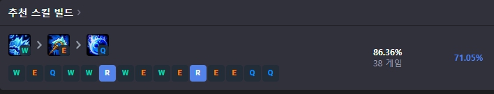 1레벨에는 W스킬을 찍어주고 2레벨에는 E, 3레벨에는 Q스킬을 찍어준 뒤 R-W-E-Q 순서로 스킬을 마스터해주시면 됩니다. 확실하게 선2렙을 찍는 상황이고 딜교가 충분히 이루어져 있는 상황인데다가 Q를 확실하게 맞출 수 있다면 2레벨에 Q스킬을 찍어줘도 되긴 합니다.