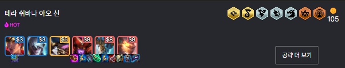 이번 시간에 알아볼 롤토체스 시즌7.5덱은 테라 쉬바나 아오신덱입니다. 말 그대로 고코스트 용인 테라와 쉬바나, 아오신을 활용하는 덱으로 굉장히 강력합니다. 덱을 완성시키기 어렵기 때문에 중반까지 어떻게 라이프를 보존하고 빠르게 9레벨을 달성하느냐가 핵심인 덱입니다. 그러면 테라 쉬바나 아오신덱은 어떤 챔피언들로 구성되어 있고, 어떤 특성들을 챙길 수 있는지, 증강체는 무엇을 선택해야 하는지, 아이템은 누구에게 무엇을 줘야 하는지, 기본적인 운영법까지 한번 알아보도록 하겠습니다.