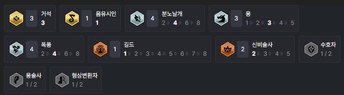 덱을 완성시키면 챙길 수 있는 특성들은 거석(3), 음유시인(1), 분노날개(4), 용(3), 폭풍(4), 길드(1), 신비술사(2)입니다.