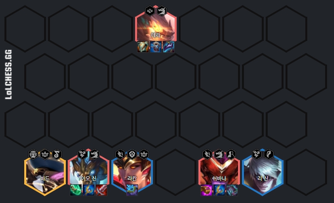 기본적으로 라칸, 리신, 바드, 쉬바나, 아오신, 테라로 이루어져 있습니다. 9레벨을 달성해야 덱을 완성시킬 수 있습니다.