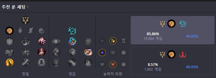 원딜 루시안 룬은 정밀에서 집중 공격을 메인으로 사용합니다. 하위 룬으로는 침착과 전설: 핏빛 길, 최후의 일격을 들어주고, 보조룬으로는 영감에서 마법의 신발과 비스킷 배달을 들어주면 됩니다. 능력치 파편은 공격 속도와 적응형 능력치, 방어력을 들어주면 되구요.
