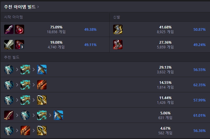 루시안 템트리는 도란의 검과 포션 하나로 시작해주며 첫 코어 아이템으로 돌풍을 올리고, 광전사의 신발까지 올립니다. 이후에는 징수의 총을 띄워준 뒤에 상황을 보고 세릴다의 원한, 고속 연사포, 무한의 대검 등의 아이템을 유동적으로 올려주면 됩니다.