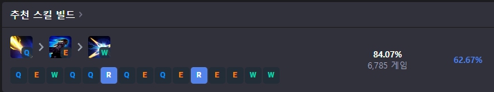 1레벨에는 Q스킬, 2레벨에는 E스킬, 3레벨에는 W스킬을 찍어준 뒤 4레벨부터 R-Q-E-W 순서로 스킬을 마스터해주면 됩니다.