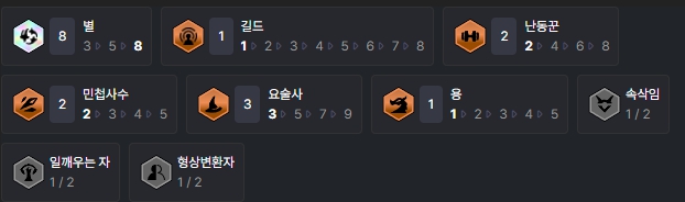 덱을 완성시키면 챙길 수 있는 특성은 별(8), 길드(1), 난동꾼(2), 민첩사수(2), 요술사(3), 용(1)입니다.