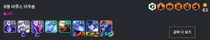 8별 아우솔덱은 기본적으로 니달리, 블라디미르, 스카너, 럭스, 바루스, 트위치, 아우솔로 이루어져 있습니다. 만약 요술사 상징이나 특성을 하나 보유중이라면 트위치 대신 조이를 넣어 요술사(5)를 챙기는 것도 좋은 방법입니다.