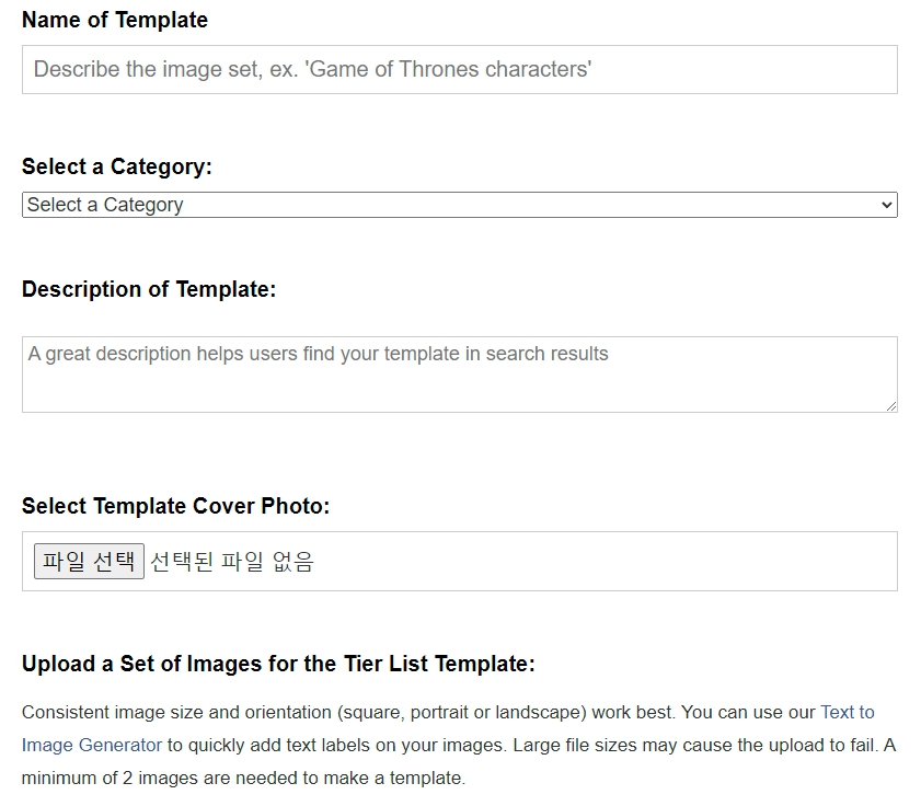 차례대로 템플릿 이름, 카테고리 선택, 템플릿 설명, 템플릿 커버 이미지, 티어를 구분할 이미지들입니다.