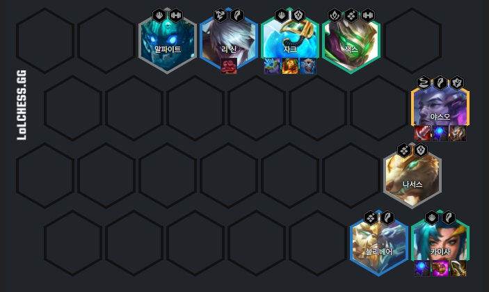 기본적인 덱 구성은 나서스, 말파이트, 자크, 잭스, 카이사, 리신, 볼리베어, 야스오로 이루어져 있습니다.
