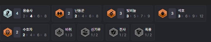챙길 수 있는 특성은 용술사(4), 난동꾼(2), 빛비늘(3), 석호(3), 수호자(2)입니다.