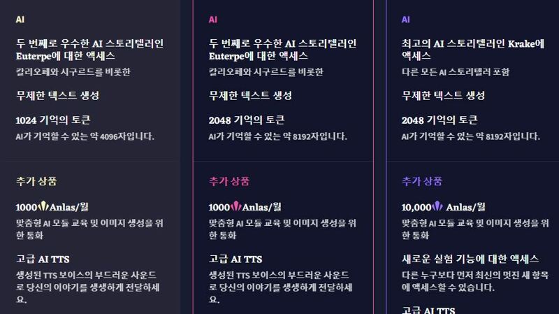 구독 종류는 세 가지인데 Tablet, Scroll, Opus로 나뉘어집니다. 가격이 각각 월 10$, 15$, 25$로 차이가 있으며 그만큼 혜택에도 차이가 있습니다. 본인이 얼마나 Novel Ai를 사용할 지에 따라 원하는 것을 고르시면 되겠죠?