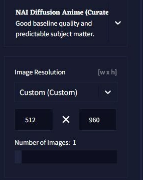 우측 맨 위는 Full로 설정해주시면 됩니다. 다음에는 Image Resolution(해상도 결정)인데 여기에서 출력 이미지의 픽셀 크기에 따라 다양한 설정이 있고, 해상도가 높아질수록 Anlas의 소모가 더 커지게 됩니다.