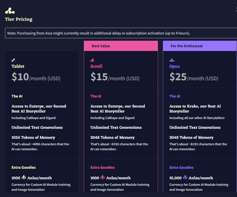 구독 종류는 세 가지인데 Tablet, Scroll, Opus로 나뉘어집니다. 가격이 각각 월 10$, 15$, 25$로 차이가 있으며 그만큼 혜택에도 차이가 있습니다. 본인이 얼마나 Novel Ai를 사용할 지에 따라 원하는 것을 고르시면 되겠죠?