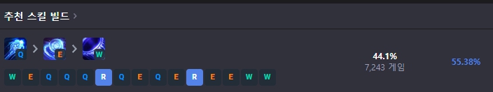 1레벨에는 W스킬, 2레벨에는 E스킬을 찍어주고 3레벨부터는 R-Q-E-W 순서대로 스킬을 마스터해주시면 됩니다.
