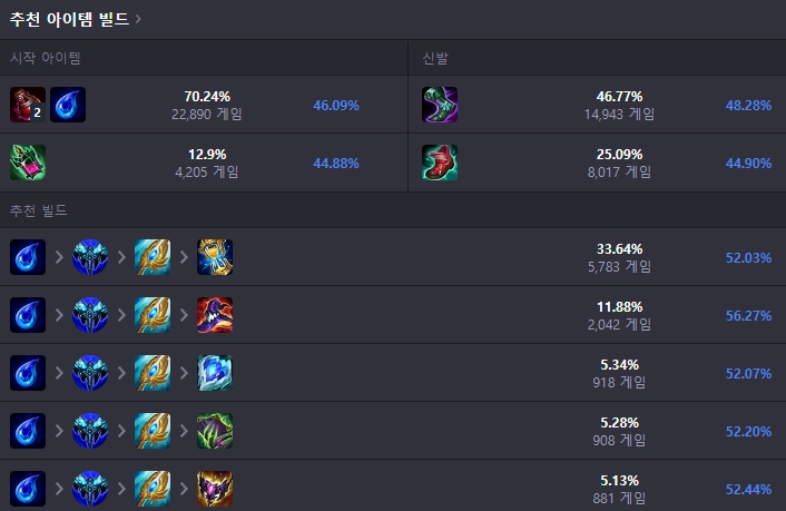처음 시작 아이템은 여신의 눈물과 포션 두개로 시작하여 첫 코어 아이템으로는 만년 서리를 올려줍니다. 만년 서리를 올린 뒤 신발은 마법사의 신발을 띄워줍니다. 이후에는 구매했던 여눈을 대천사의 지팡이까지 고정으로 띄워줍니다. 여기까지 올린 뒤에는 자신이 자주 물린다 싶으면 존야, 딜이 부족하다 싶으면 라바돈, 딜은 충분한데 방어력이 필요하다면 얼어붙은 심장 등 상황에 맞게 유동적으로 템트리를 올려줍니다.