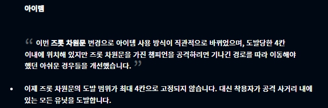 즈롯 차원문의 도발 범위가 장착한 챔피언의 공격 사거리 내의 모든 유닛을 도발하도록 변경되었습니다.