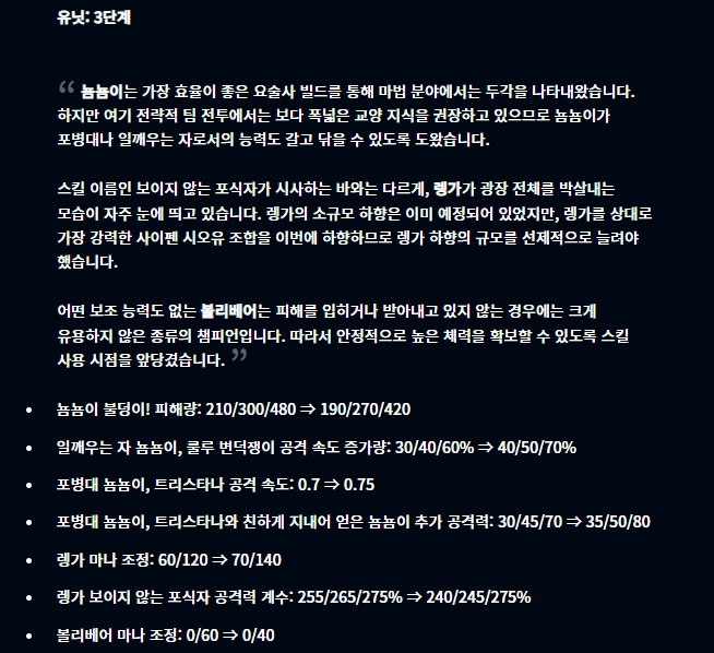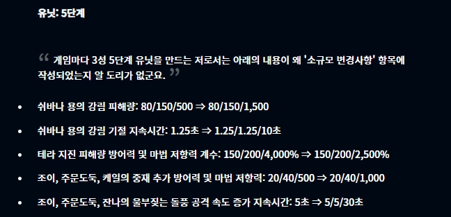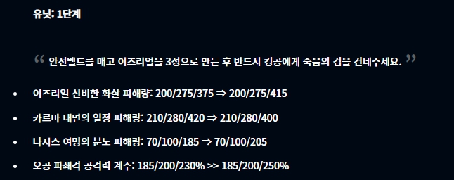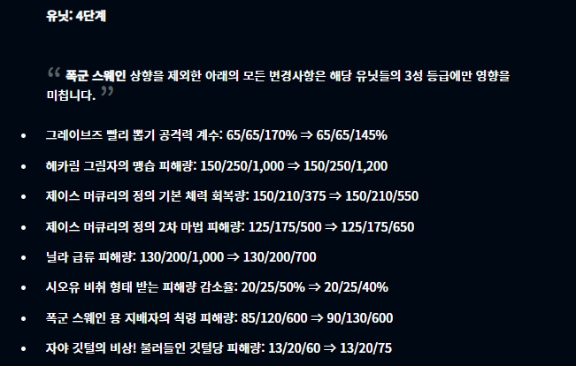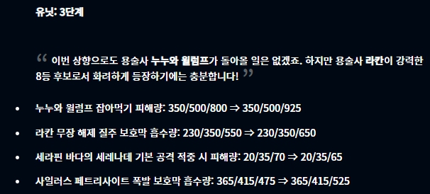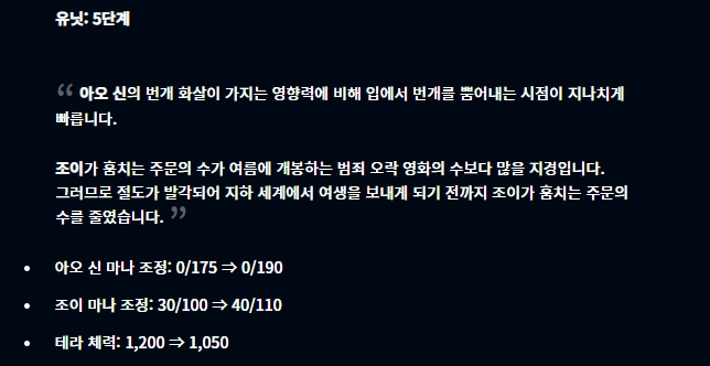 3성 이즈리얼의 스킬 공격력이 버프되었고, 반대로 카르마 3성의 경우 스킬 딜이 너프되었습니다. 그 외에 시오유도 너프되었고 기타 여러 챔피언들이 너프 및 버프되었습니다.