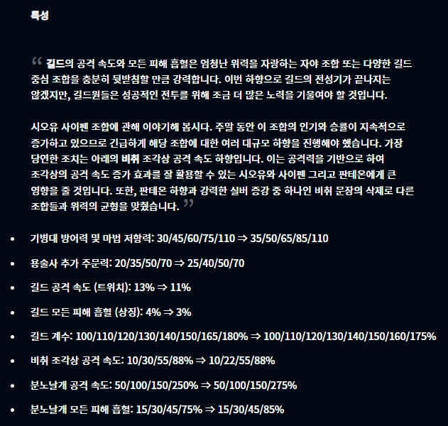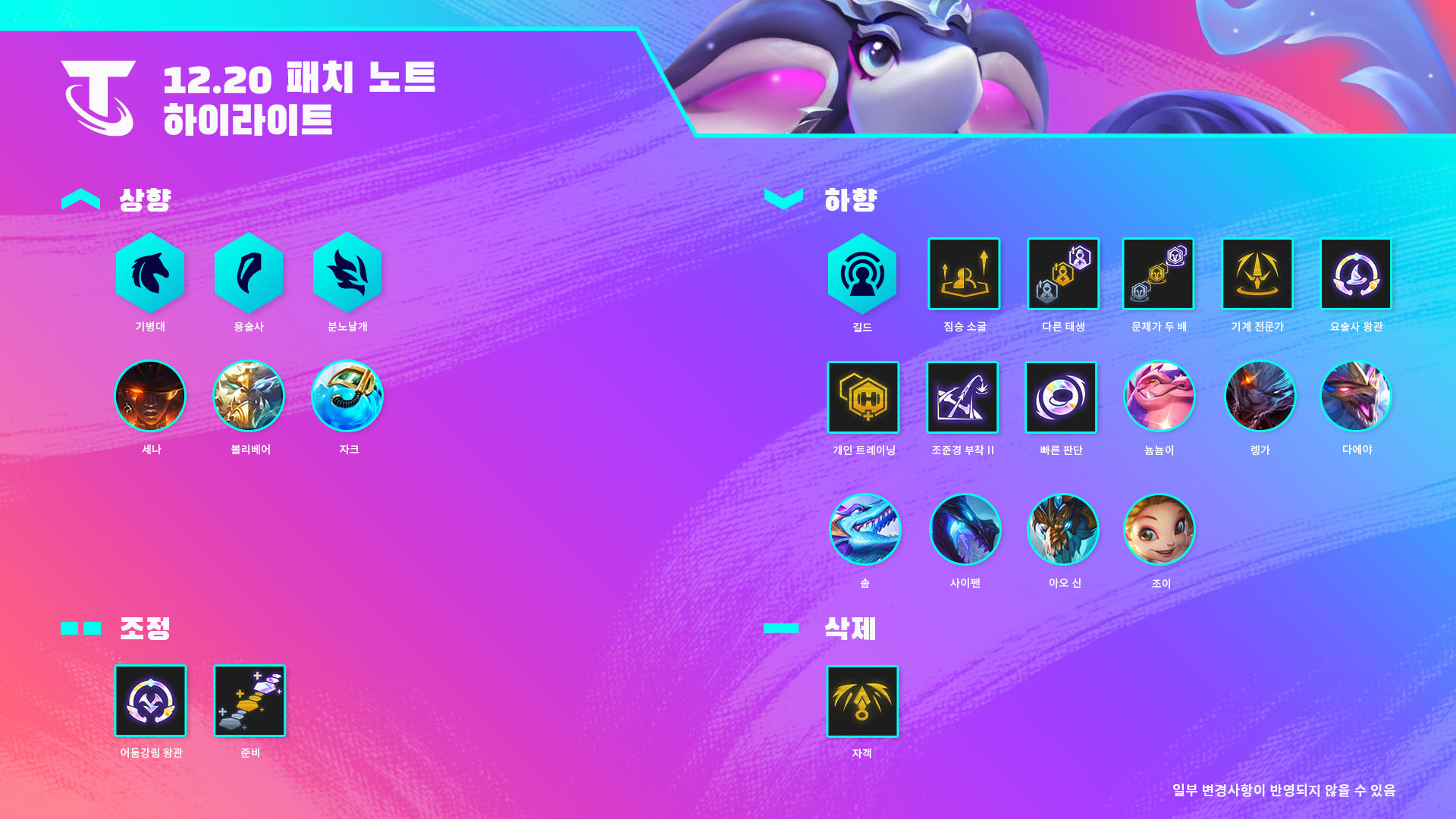 12.20 패치노트 하이라이트를 살펴보면 우선 특성 면에서는 기병대, 용술사, 분노날개가 상향, 길드가 너프되었으며 증강체 부분은 대부분 너프 및 조정입니다. 그리고 챔피언들의 경우 너무 많아서 아래에서 천천히 살펴보겠습니다.